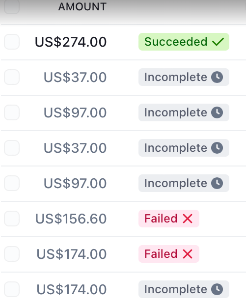 In the new Stripe version, you will most likely encounter payments marked as Incomplete. Not to worry, this is to be expected. It means exactly what is says - the order was not completed. Each time someone comes to your checkout and Stripe has shown its UI on the checkout, it creates a "payment intent". When no transaction is made, it leaves an Incomplete entry in your transaction list. The reason that these payments are created is because of the transition from the legacy Stripe Elements to the newer PaymentElement. With the new PaymentElement, a PaymentIntent must first be created before the element is displayed.