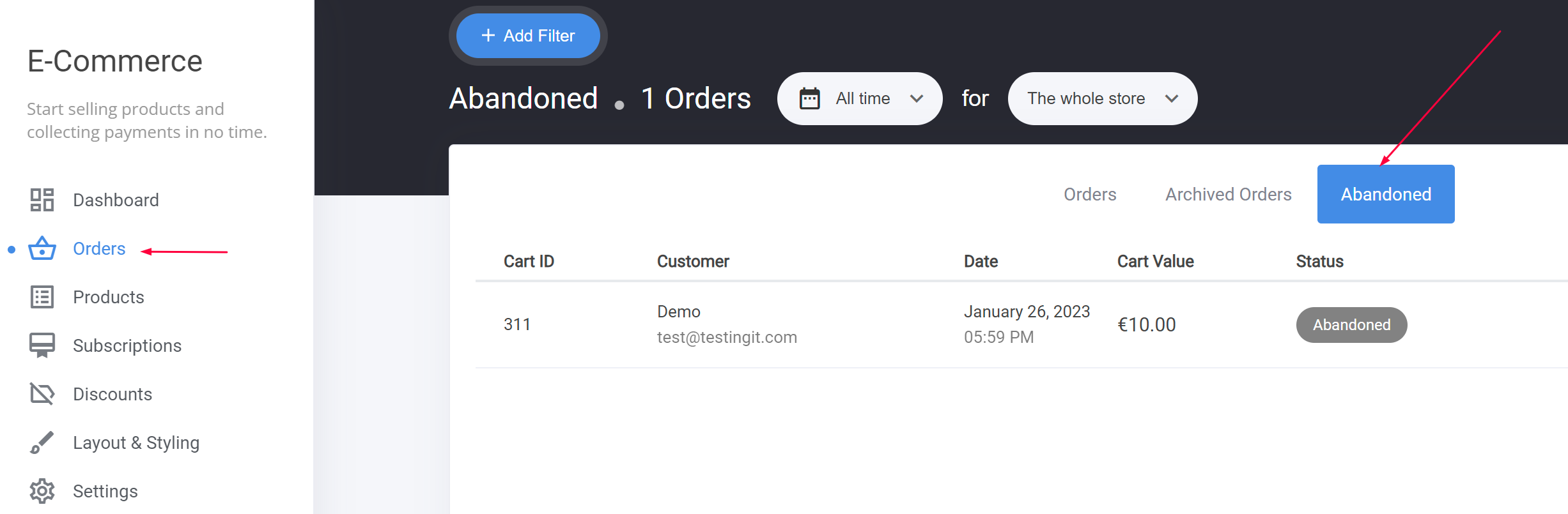 The abandoned cart functionality allows you to track and chase up uncompleted orders in your checkout. For example, suppose someone adds a product to their checkout but never completes the purchase, our platform will record this after a certain amount of time and will let you see those entries so that you can send them an email to remind them of their incomplete order or send them a discount code to indulge them further to finalize the purchase.