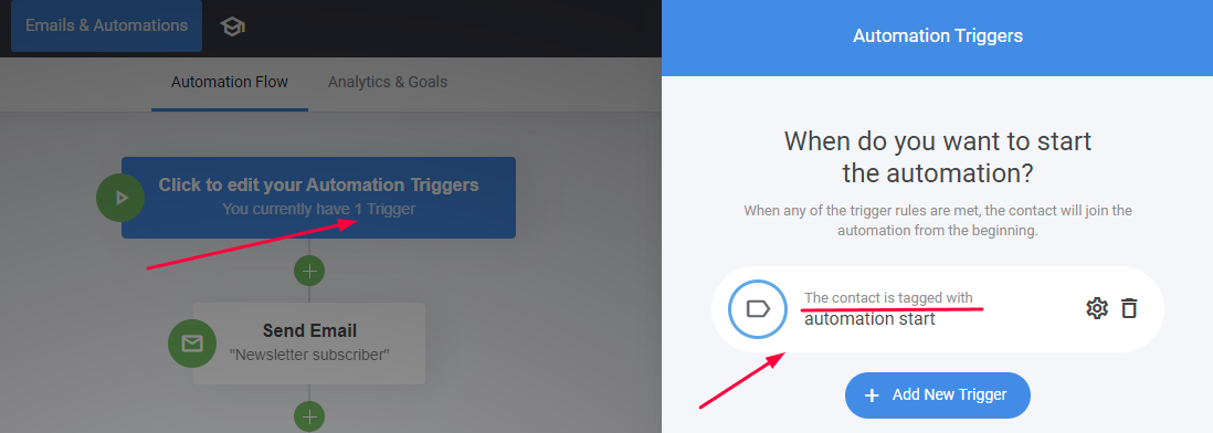 For the sake of the example, let's assume you are collecting leads via newsletter subscription form and you want to place them into an automation that send them one or a series of emails. Normally, on the newsletter subscription form, you would have the option to give a tag enabled with a Tag selected. In this case, we have the "automation start" tag. As seen below, the tag is selected in the Form settings and added as a Trigger to the automation.
