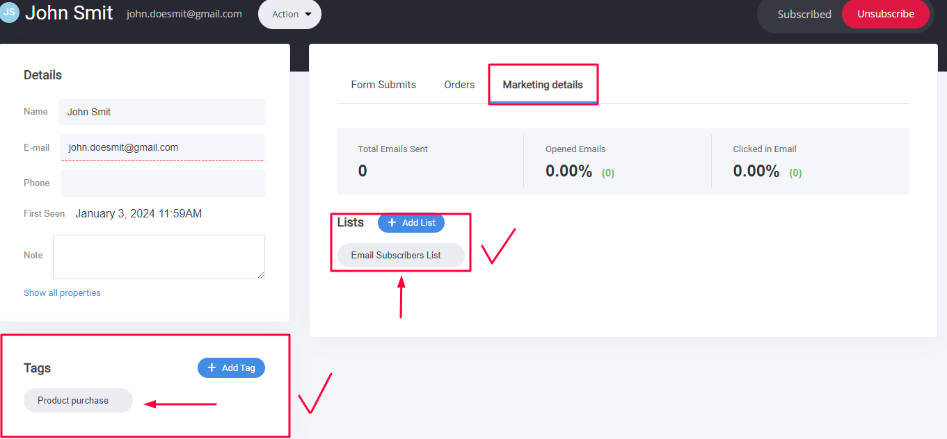 - Check if the client is receiving the tag by going to the CRM, find the Contact and access their profile to see if they have it. There you can see if they are part of the email list as well.