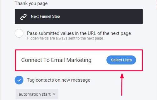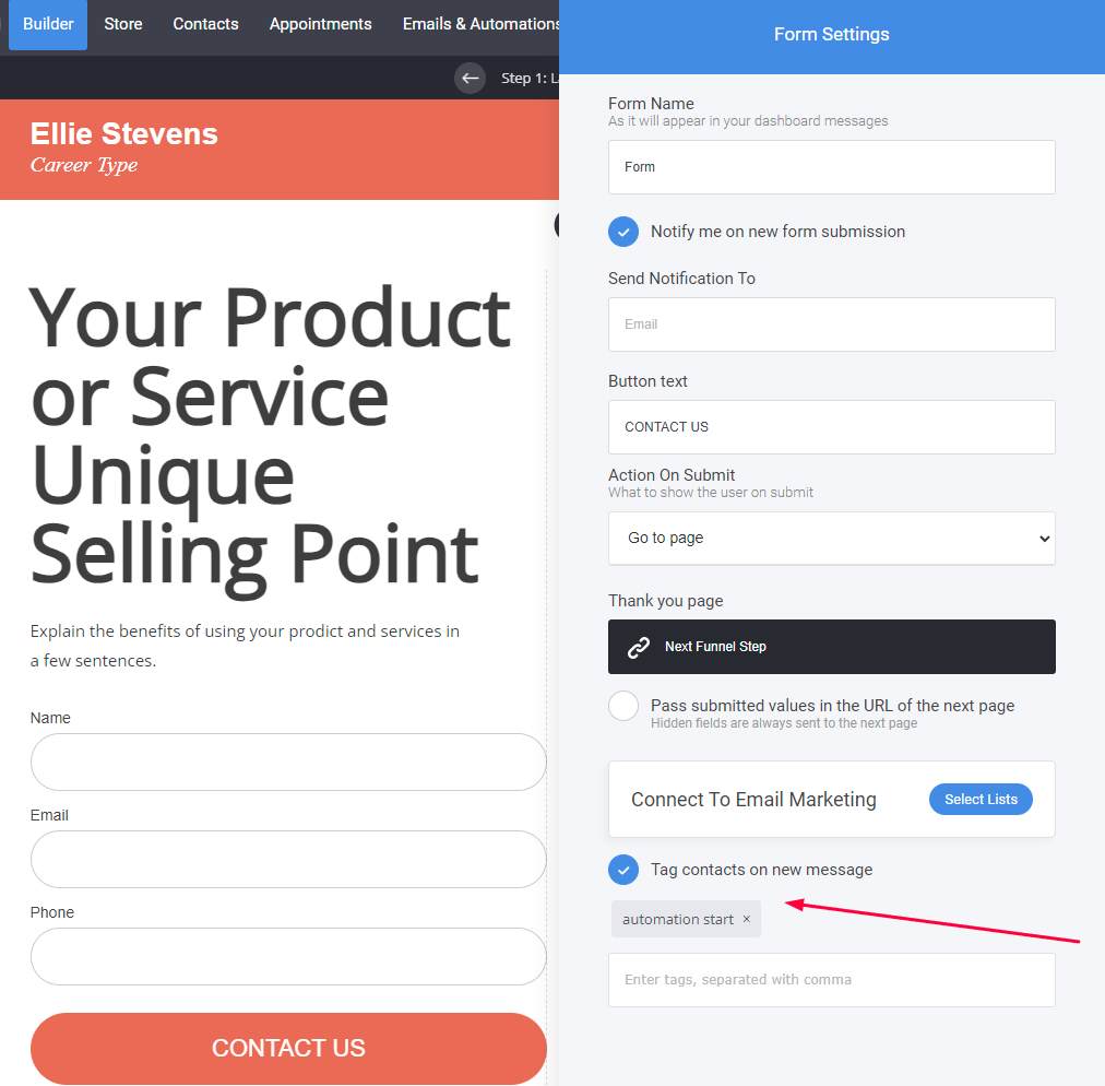 Now, when someone submits the form, they will be both, given the Tag "automation start" and added to the List you've created, essentially making them an email subscriber and enabling the User to take part in your automations and email campaigns.